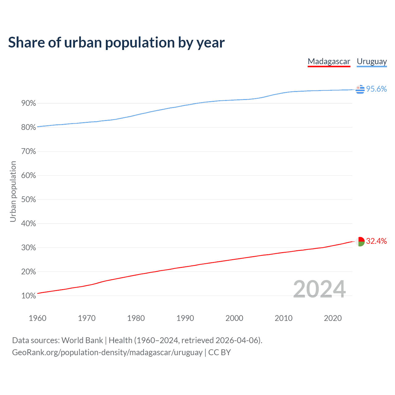 From 2004 to 2024, the share of urban population changed from 26.2% to 32.4% in Madagascar and from 91.8% to 95.6% in Uruguay.
