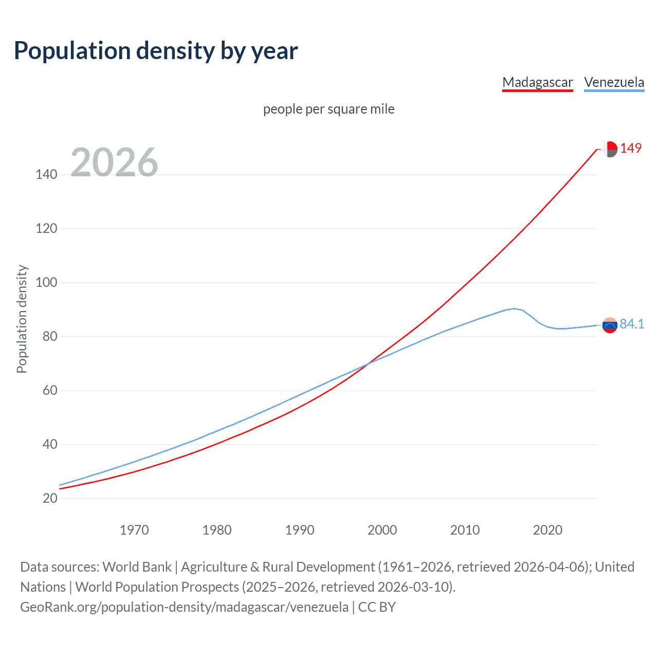 From 2006 to 2026, population density in Madagascar increased by 69.9%, compared to a 5.16% growth in Venezuela.