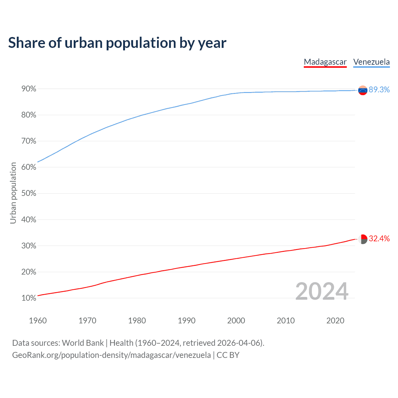 From 2004 to 2024, the share of urban population changed from 26.2% to 32.4% in Madagascar and from 88.6% to 89.3% in Venezuela.