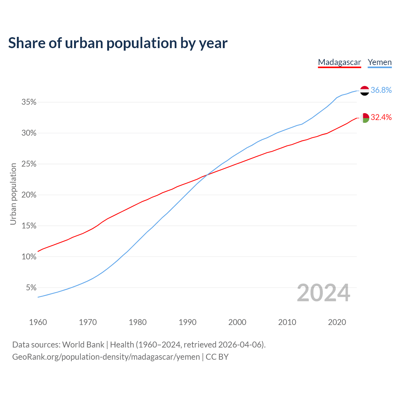 From 2004 to 2024, the share of urban population changed from 26.2% to 32.4% in Madagascar and from 28.5% to 36.8% in Yemen.