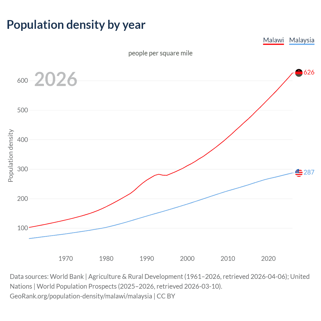 From 2006 to 2026, population density in Malawi increased by 72.7%, compared to a 37.8% growth in Malaysia.