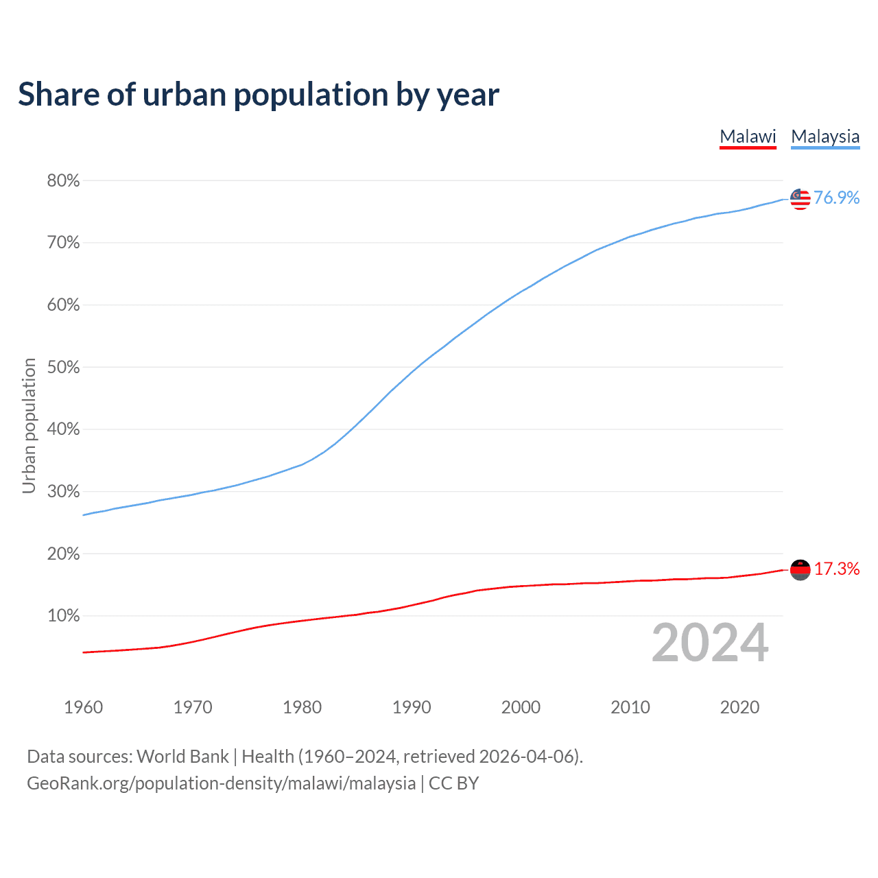From 2004 to 2024, the share of urban population changed from 15% to 17.3% in Malawi and from 66.1% to 76.9% in Malaysia.