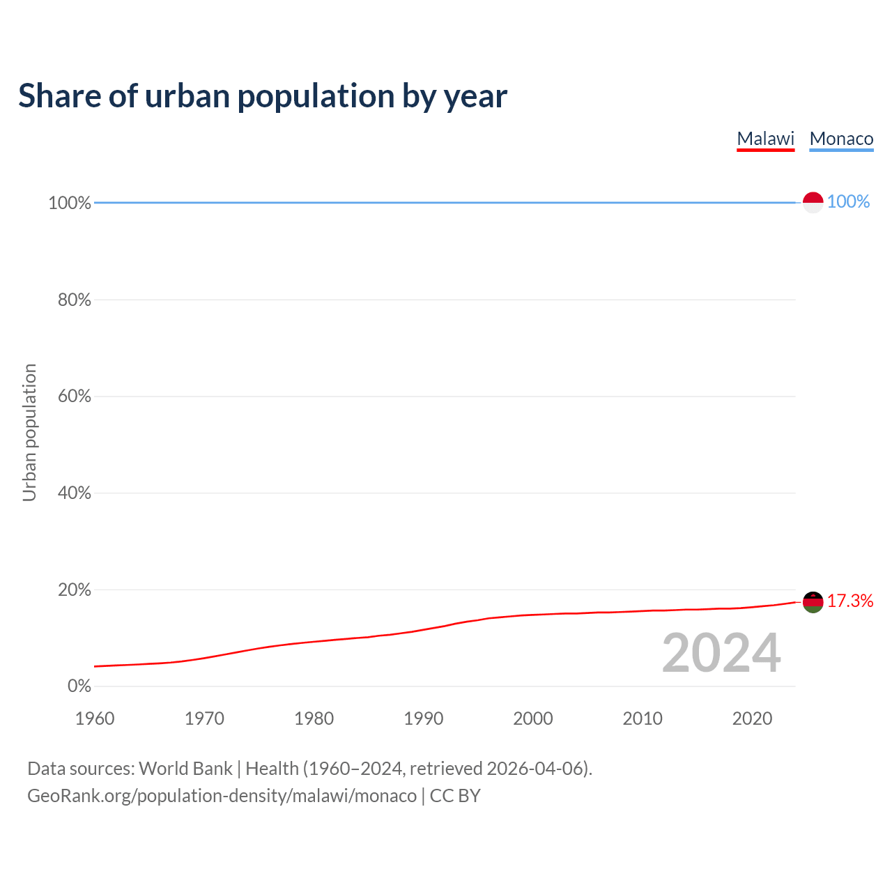 From 2004 to 2024, the share of urban population changed from 15% to 17.3% in Malawi and from 100% to 100% in Monaco.
