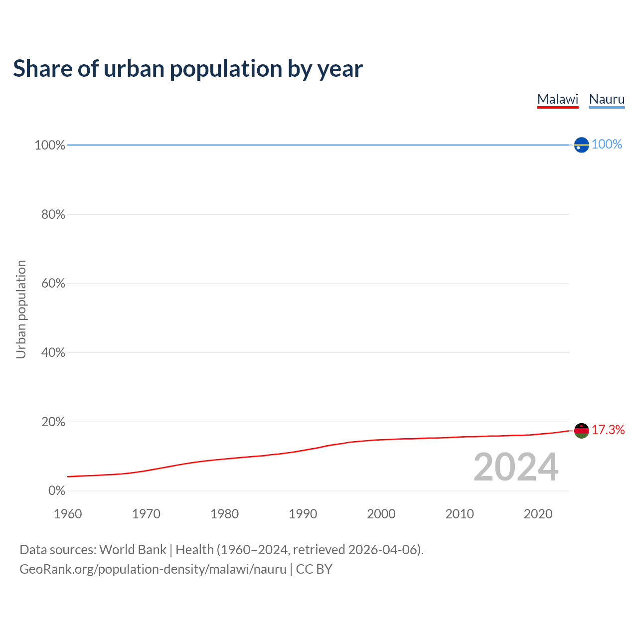 From 2004 to 2024, the share of urban population changed from 15% to 17.3% in Malawi and from 100% to 100% in Nauru.