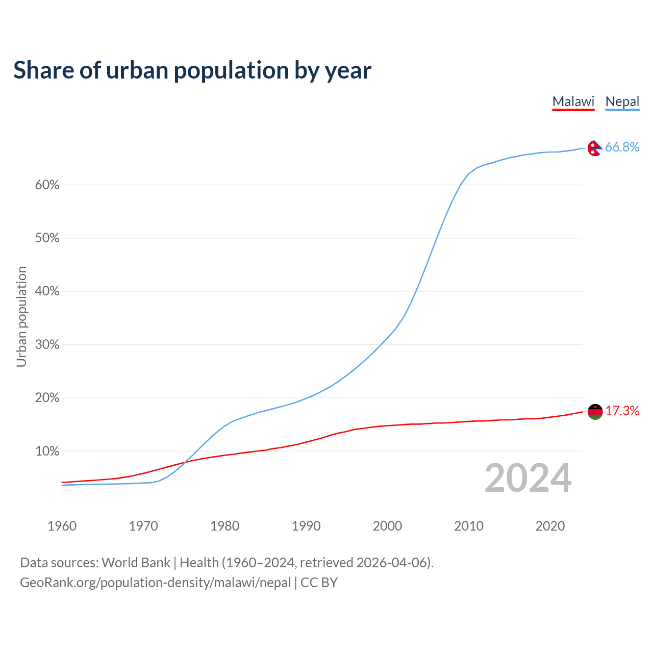 From 2004 to 2024, the share of urban population changed from 15% to 17.3% in Malawi and from 41.6% to 66.8% in Nepal.