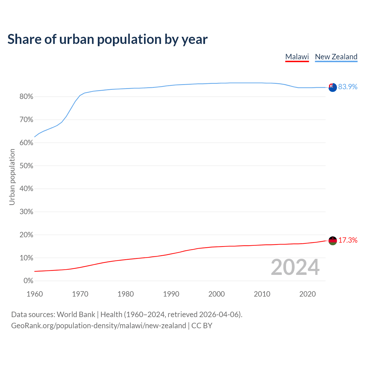 From 2004 to 2024, the share of urban population changed from 15% to 17.3% in Malawi and from 85.9% to 83.9% in New Zealand.