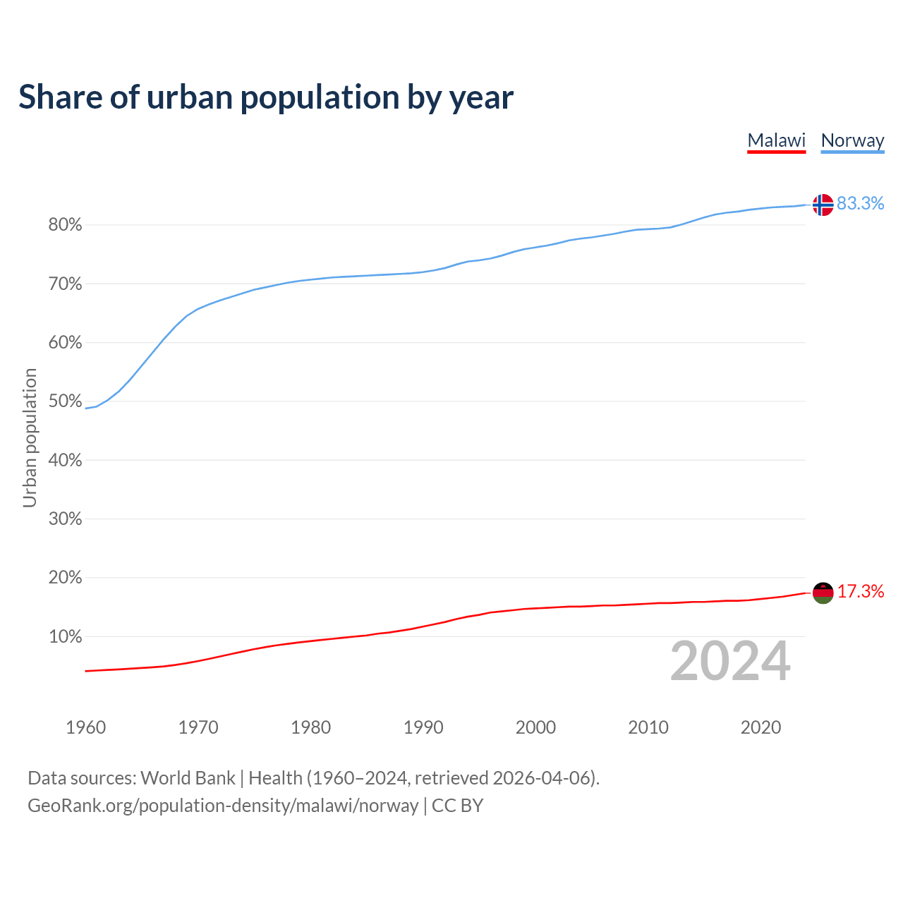 From 2004 to 2024, the share of urban population changed from 15% to 17.3% in Malawi and from 77.6% to 83.3% in Norway.