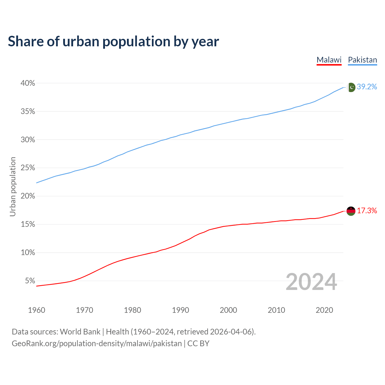 From 2004 to 2024, the share of urban population changed from 15% to 17.3% in Malawi and from 33.7% to 39.2% in Pakistan.