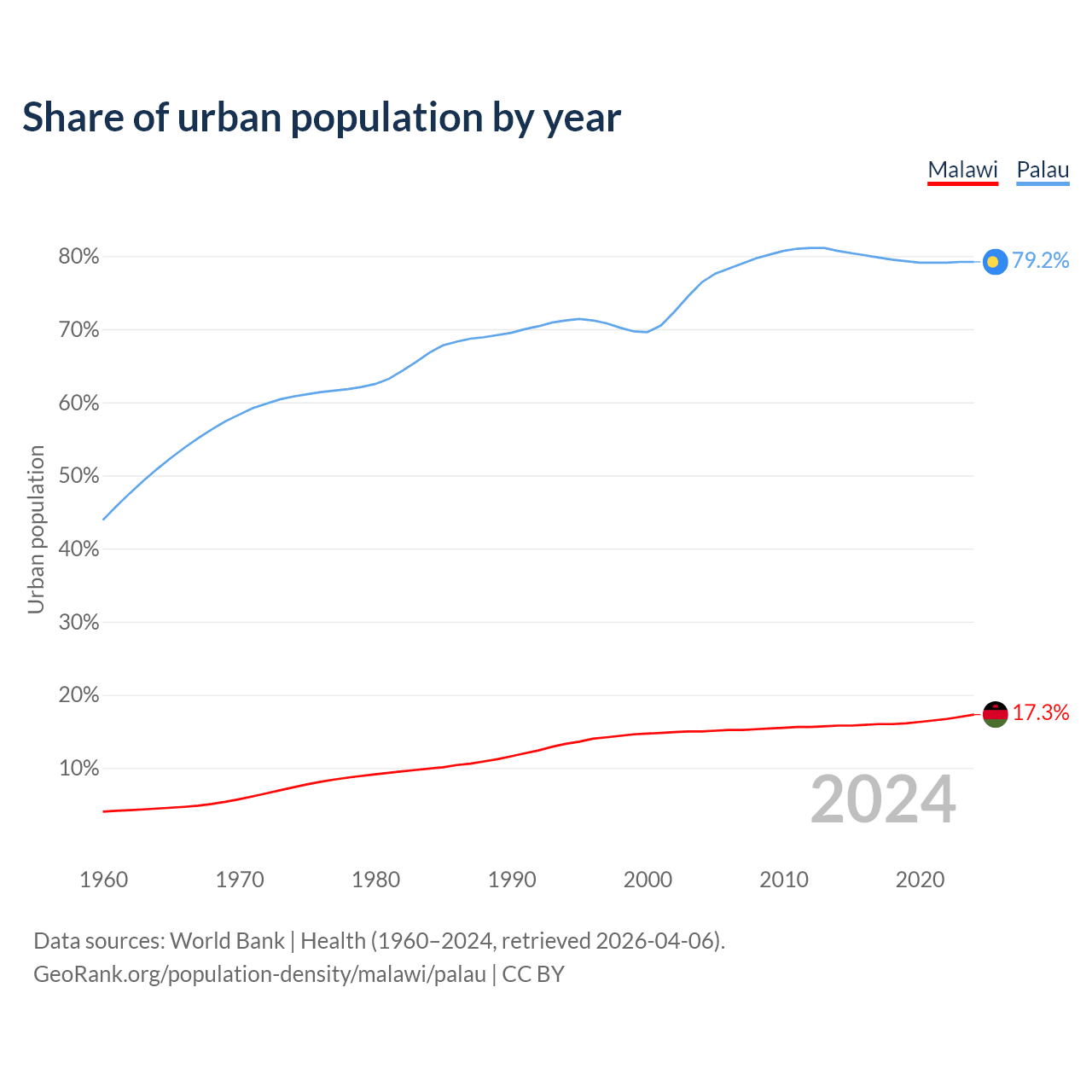 From 2004 to 2024, the share of urban population changed from 15% to 17.3% in Malawi and from 76.4% to 79.2% in Palau.