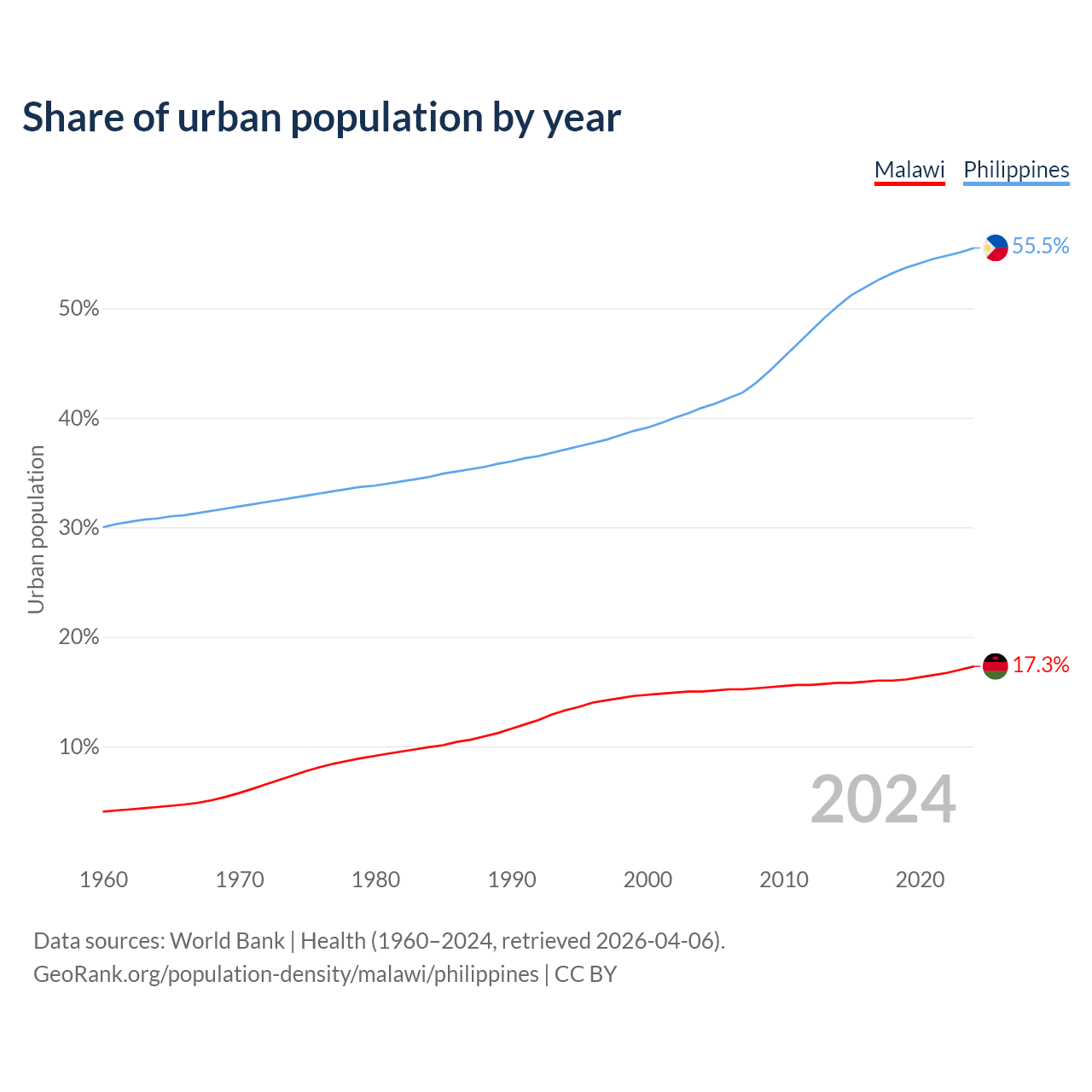 From 2004 to 2024, the share of urban population changed from 15% to 17.3% in Malawi and from 40.9% to 55.5% in the Philippines.
