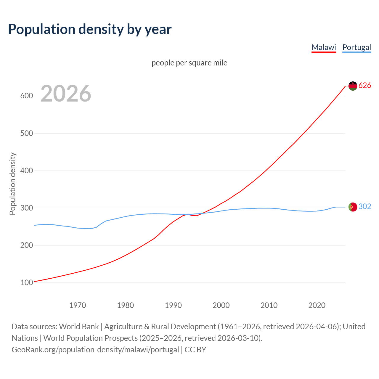 From 2006 to 2026, population density in Malawi increased by 72.7%, compared to a 1.23% growth in Portugal.