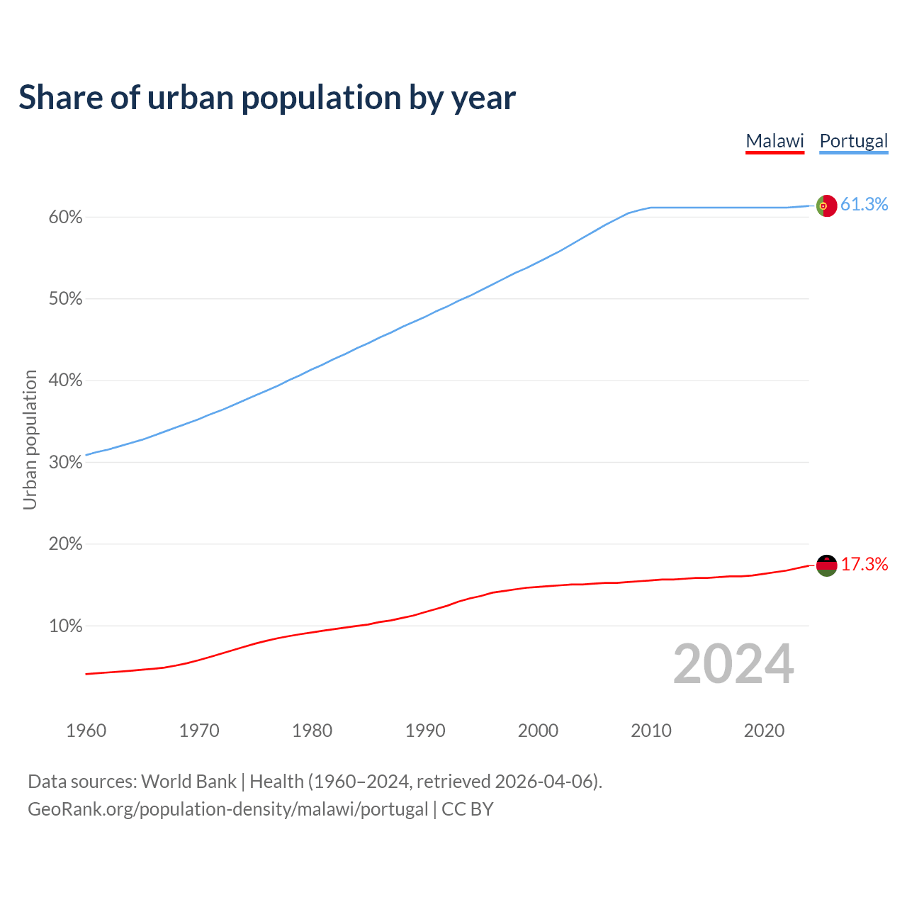 From 2004 to 2024, the share of urban population changed from 15% to 17.3% in Malawi and from 57.4% to 61.3% in Portugal.