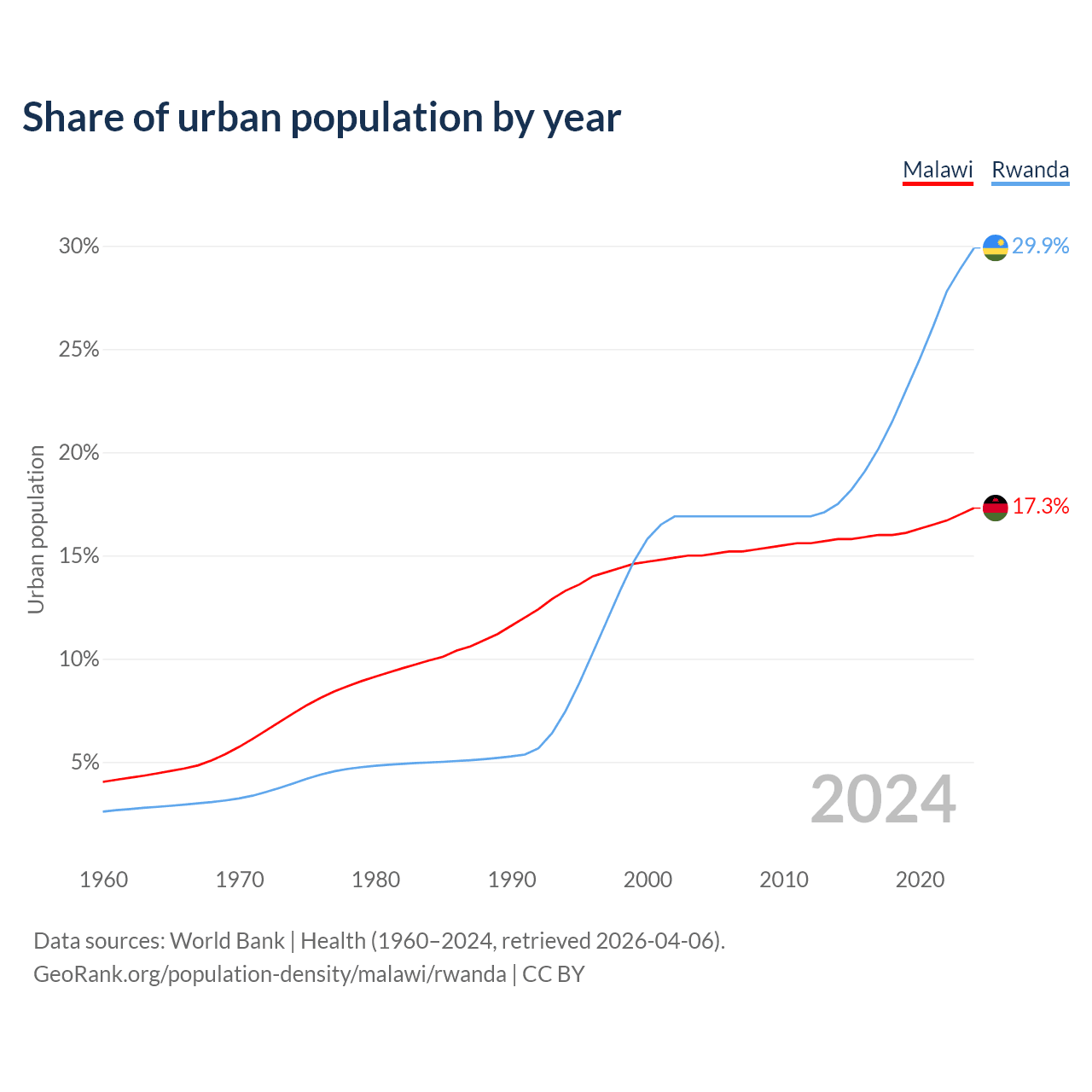 From 2004 to 2024, the share of urban population changed from 15% to 17.3% in Malawi and from 16.9% to 29.9% in Rwanda.