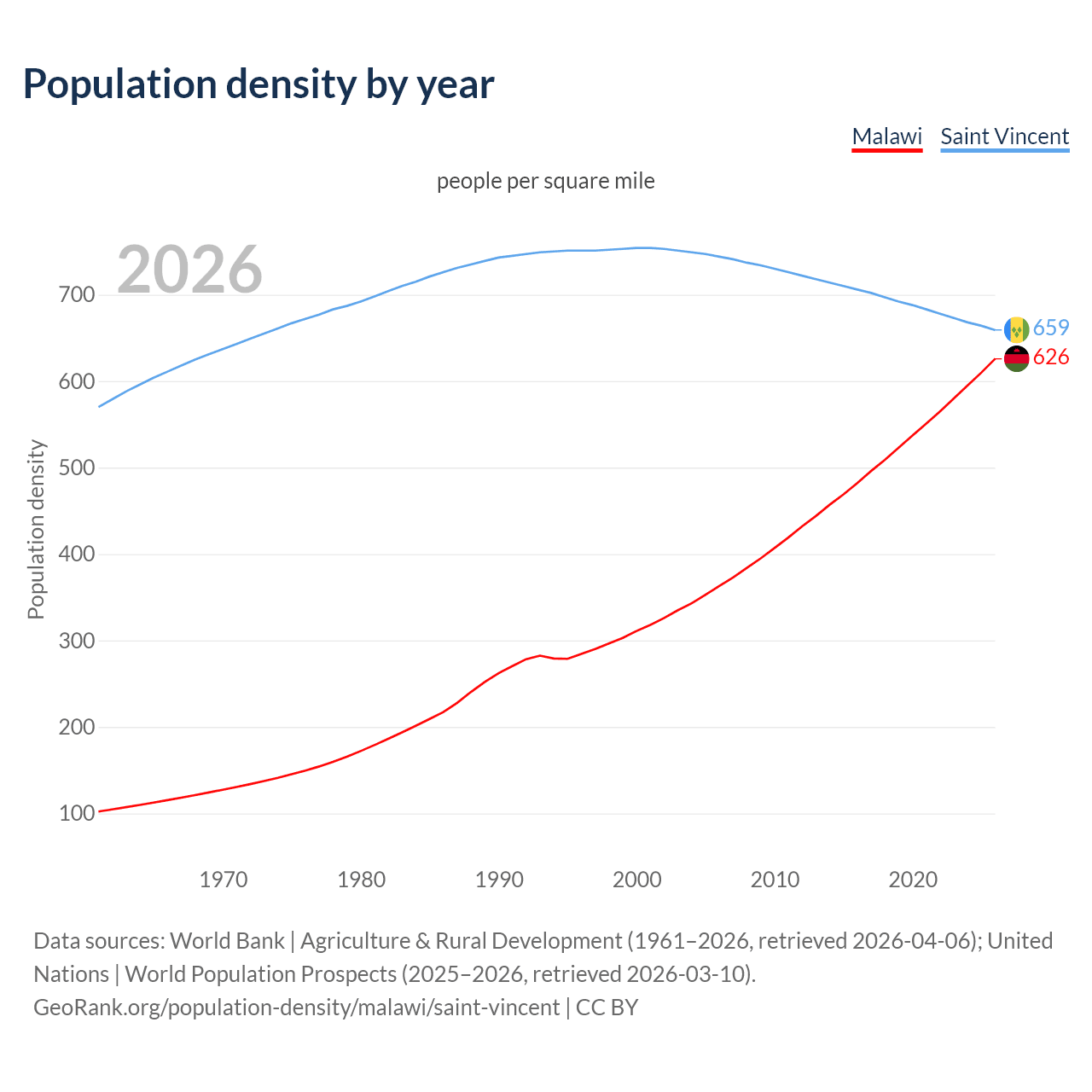 From 2006 to 2026, population density in Malawi increased by 72.7%, compared to a 11.4% decline in Saint Vincent.