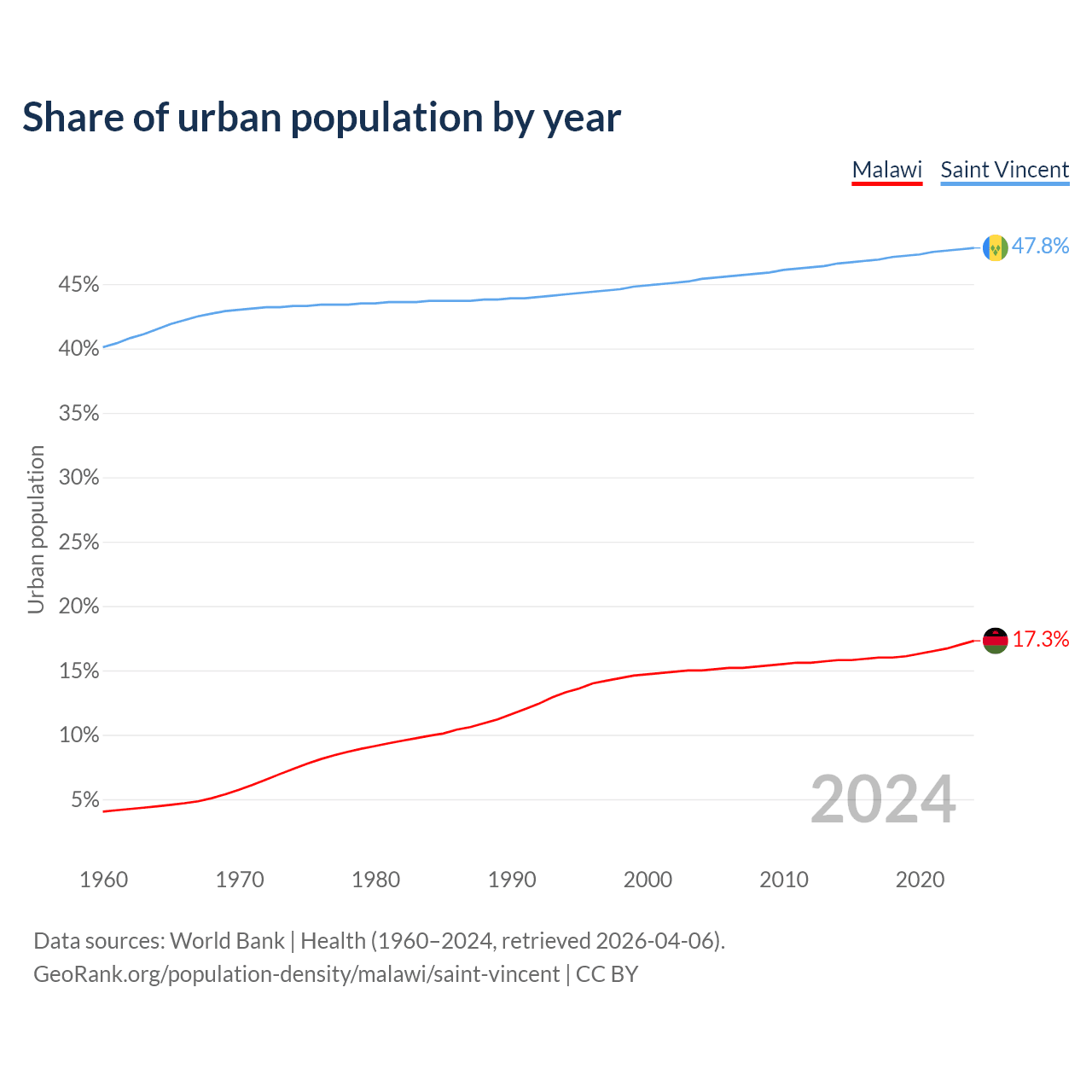From 2004 to 2024, the share of urban population changed from 15% to 17.3% in Malawi and from 45.4% to 47.8% in Saint Vincent.