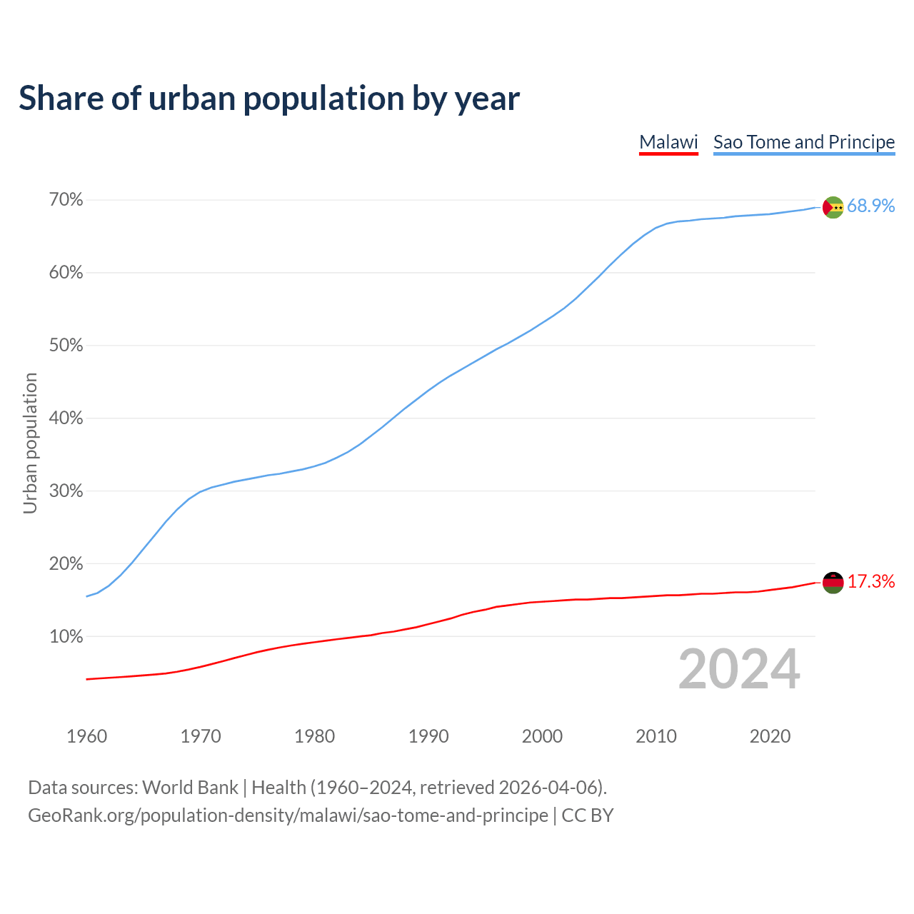 From 2004 to 2024, the share of urban population changed from 15% to 17.3% in Malawi and from 57.9% to 68.9% in Sao Tome and Principe.