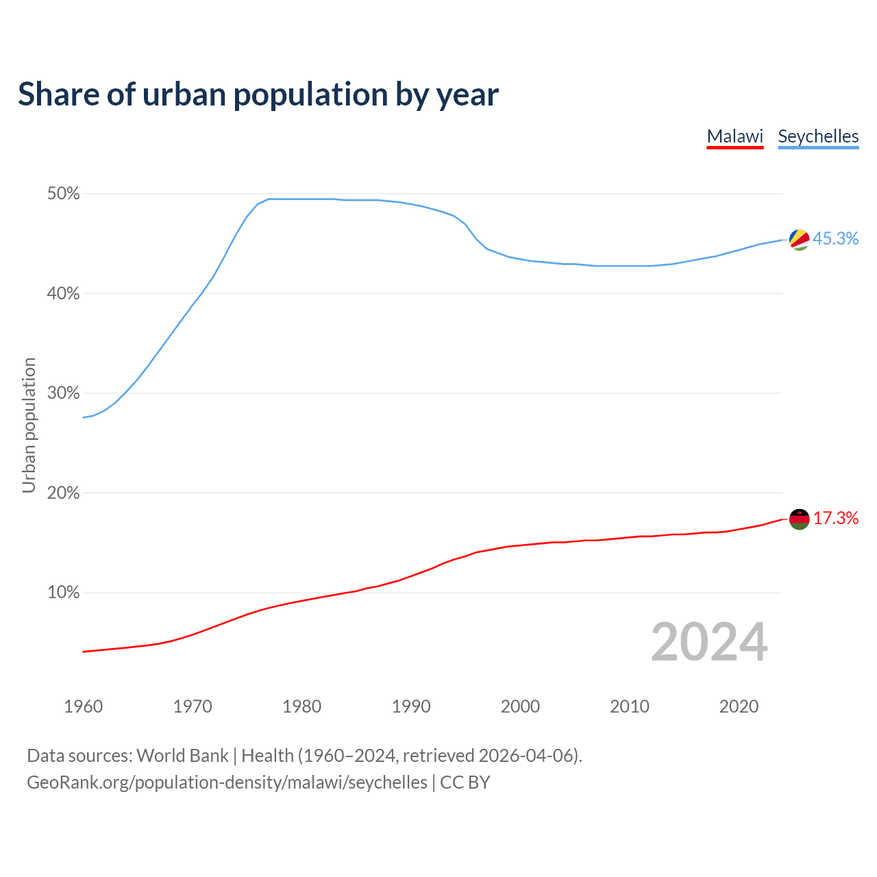 From 2004 to 2024, the share of urban population changed from 15% to 17.3% in Malawi and from 42.9% to 45.3% in the Seychelles.