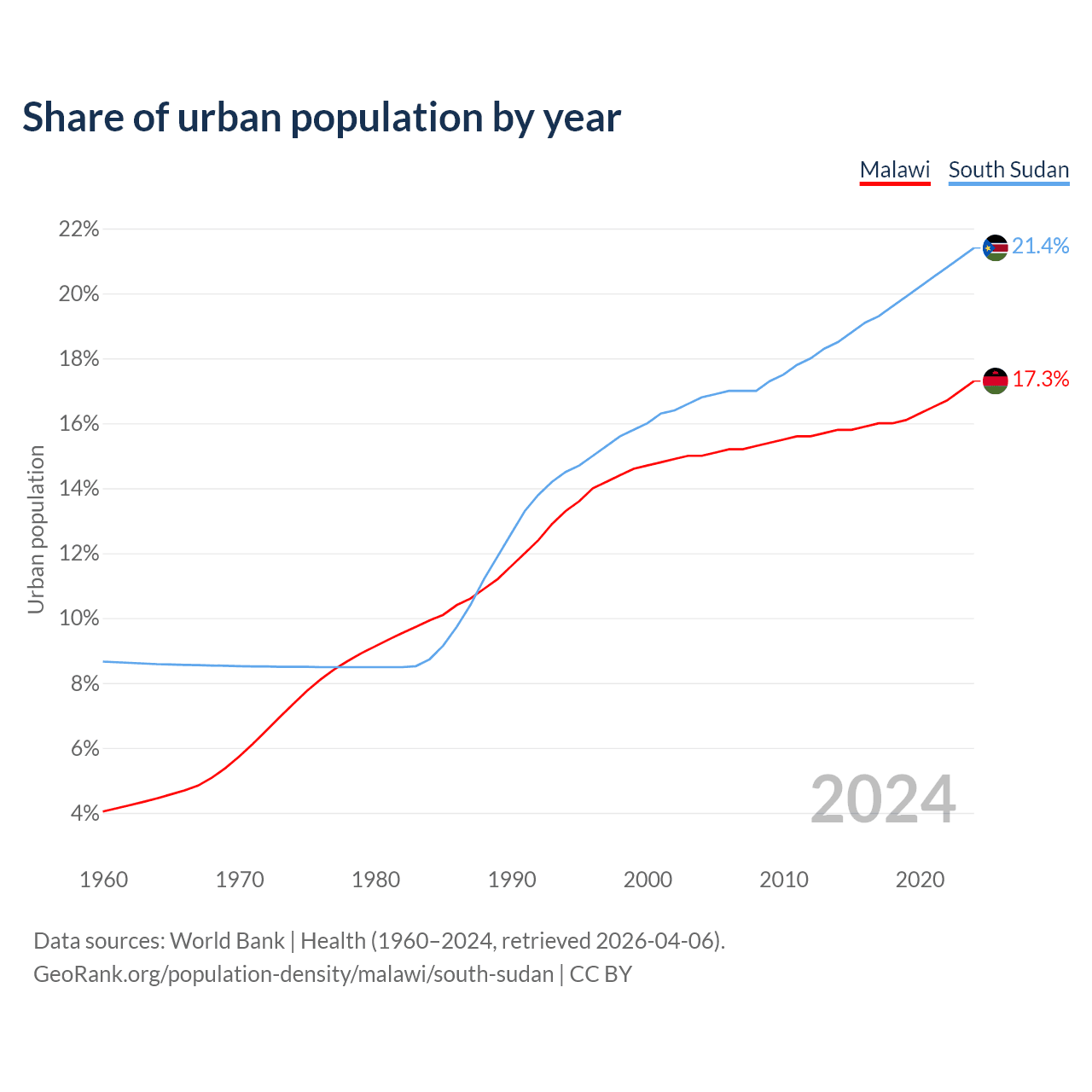 From 2004 to 2024, the share of urban population changed from 15% to 17.3% in Malawi and from 16.8% to 21.4% in South Sudan.