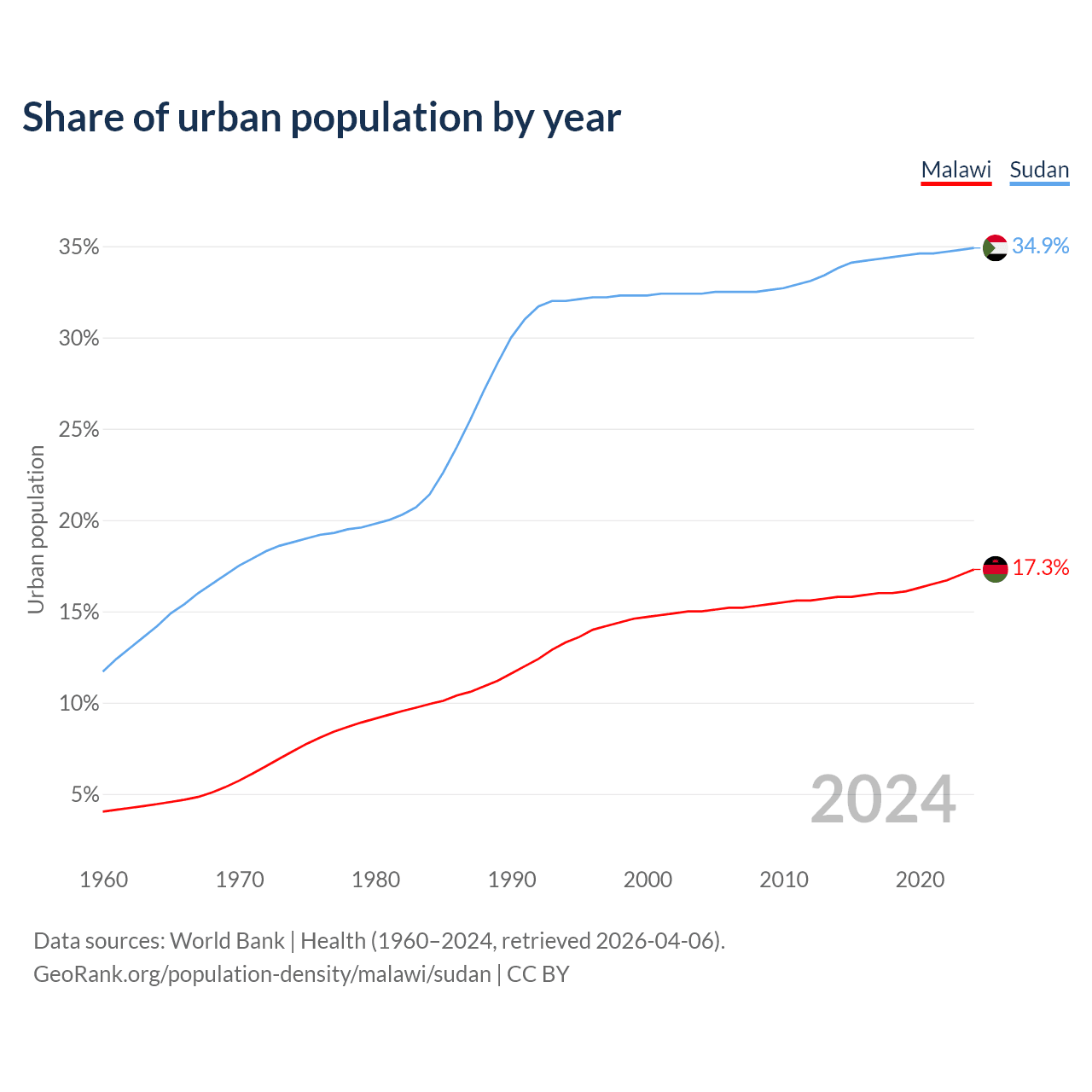 From 2004 to 2024, the share of urban population changed from 15% to 17.3% in Malawi and from 32.4% to 34.9% in Sudan.