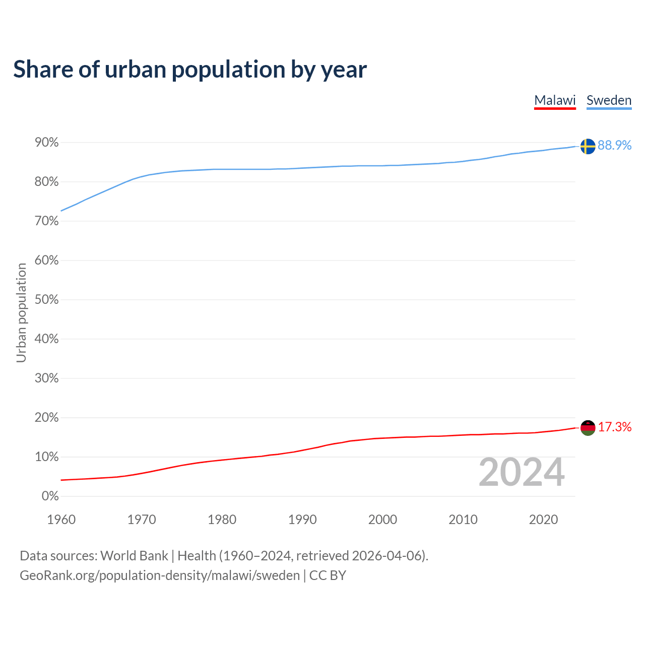 From 2004 to 2024, the share of urban population changed from 15% to 17.3% in Malawi and from 84.3% to 88.9% in Sweden.
