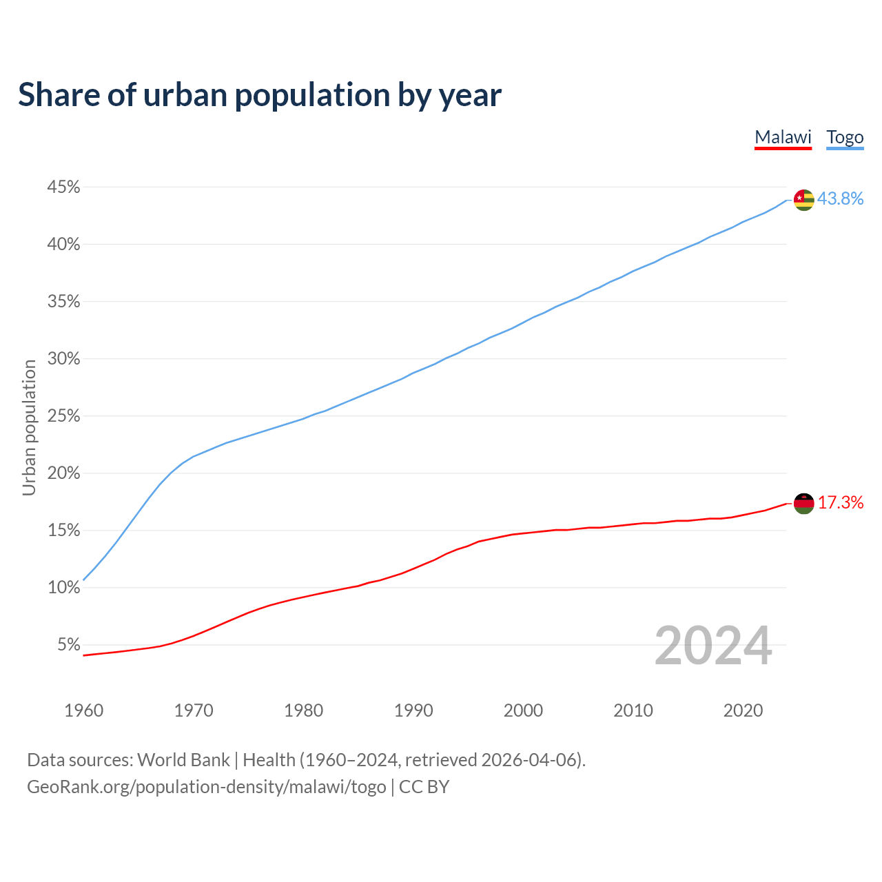 From 2004 to 2024, the share of urban population changed from 15% to 17.3% in Malawi and from 34.9% to 43.8% in Togo.