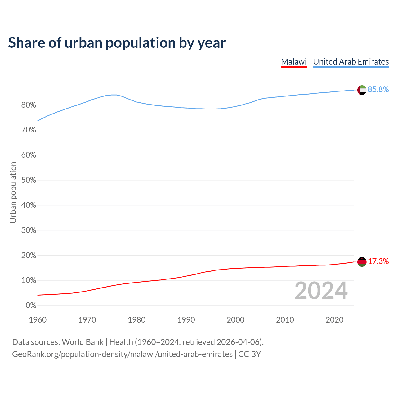 From 2004 to 2024, the share of urban population changed from 15% to 17.3% in Malawi and from 81.5% to 85.8% in the United Arab Emirates.