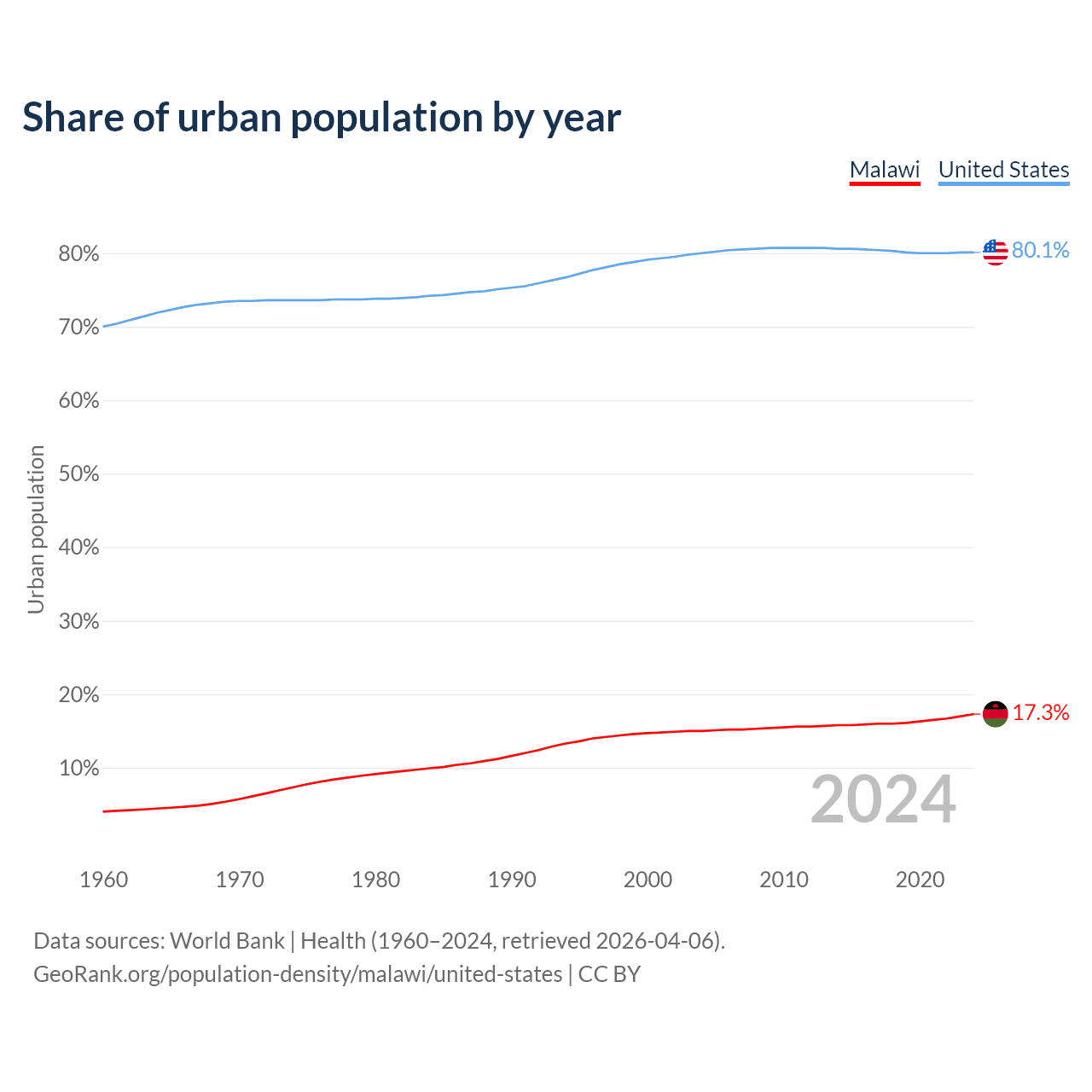 From 2004 to 2024, the share of urban population changed from 15% to 17.3% in Malawi and from 80% to 80.1% in the United States.