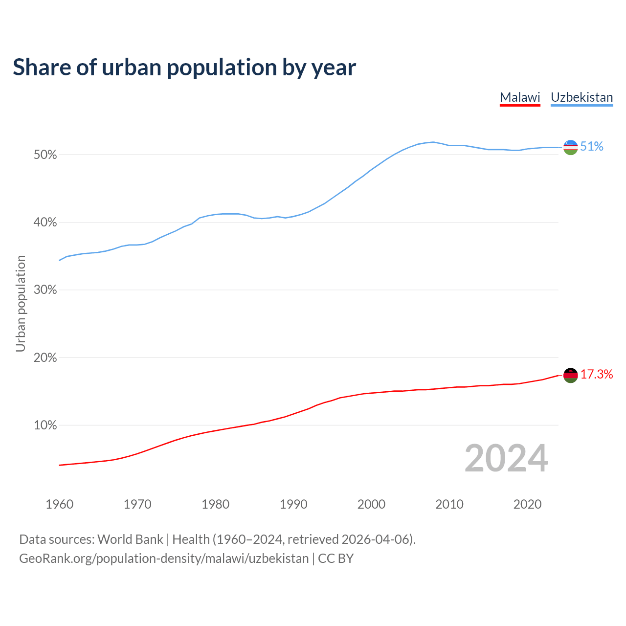 From 2004 to 2024, the share of urban population changed from 15% to 17.3% in Malawi and from 50.6% to 51% in Uzbekistan.