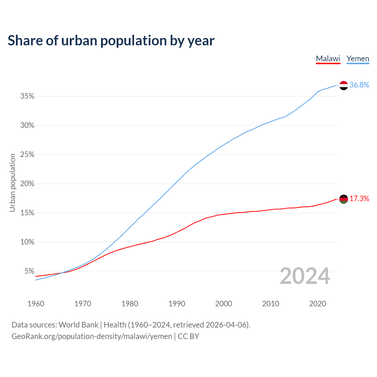 From 2004 to 2024, the share of urban population changed from 15% to 17.3% in Malawi and from 28.5% to 36.8% in Yemen.
