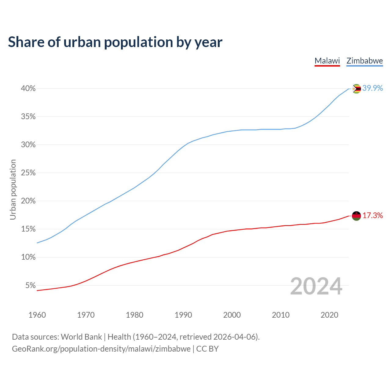 From 2004 to 2024, the share of urban population changed from 15% to 17.3% in Malawi and from 32.6% to 39.9% in Zimbabwe.