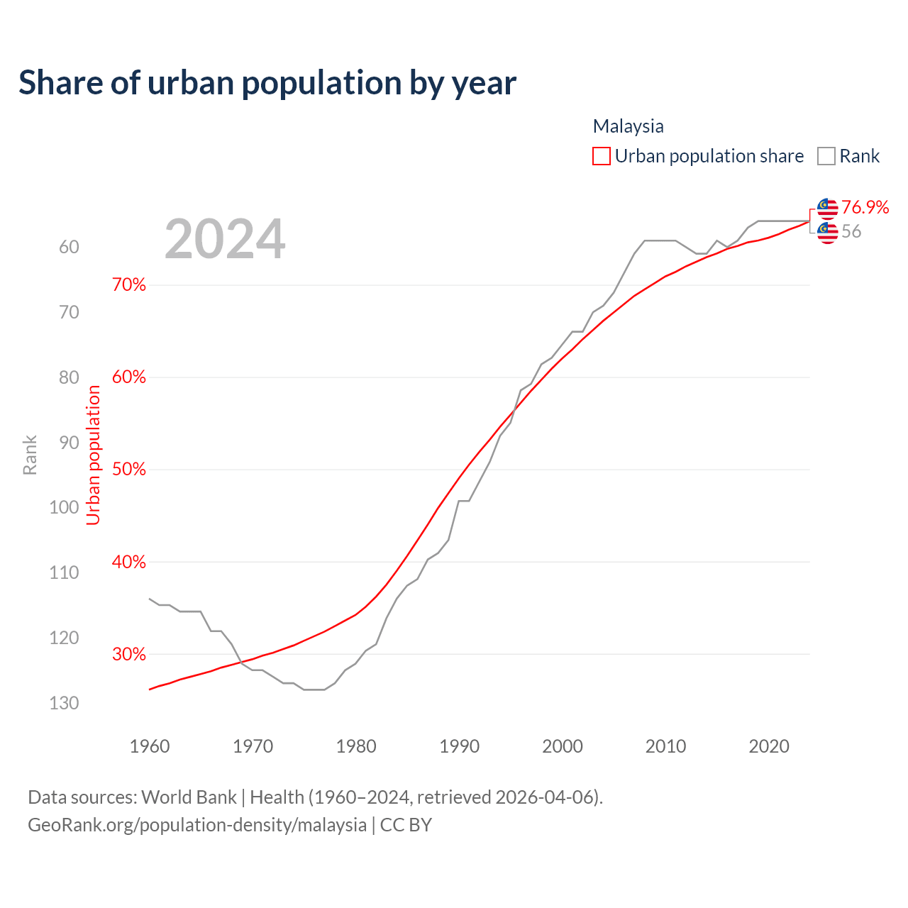 This chart shows the share of urban population in Malaysia from 1960 to 2024: 26.1% lived in urban areas in 1960, 62% in 2000, and 76.9% in 2024.