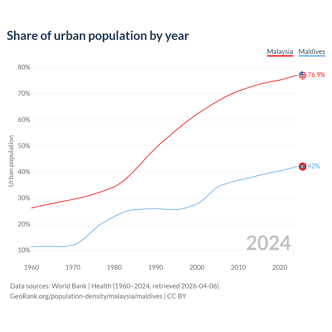 From 2004 to 2024, the share of urban population changed from 66.1% to 76.9% in Malaysia and from 32.9% to 42% in Maldives.