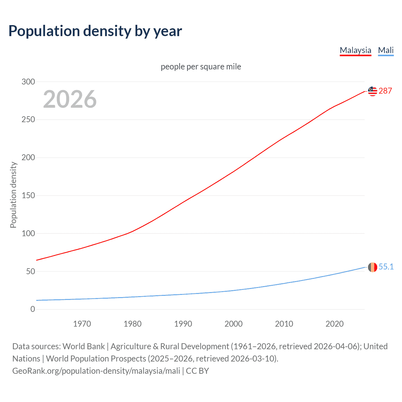 From 2006 to 2026, population density in Malaysia increased by 37.8%, compared to a 85.4% growth in Mali.