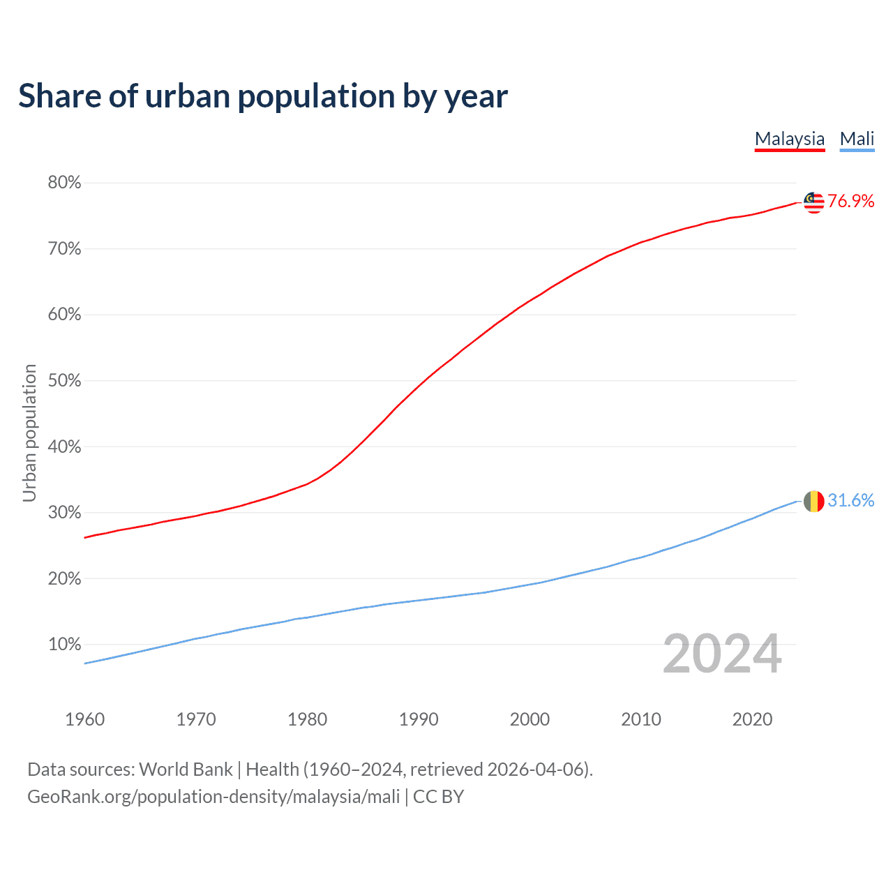 From 2004 to 2024, the share of urban population changed from 66.1% to 76.9% in Malaysia and from 20.5% to 31.6% in Mali.