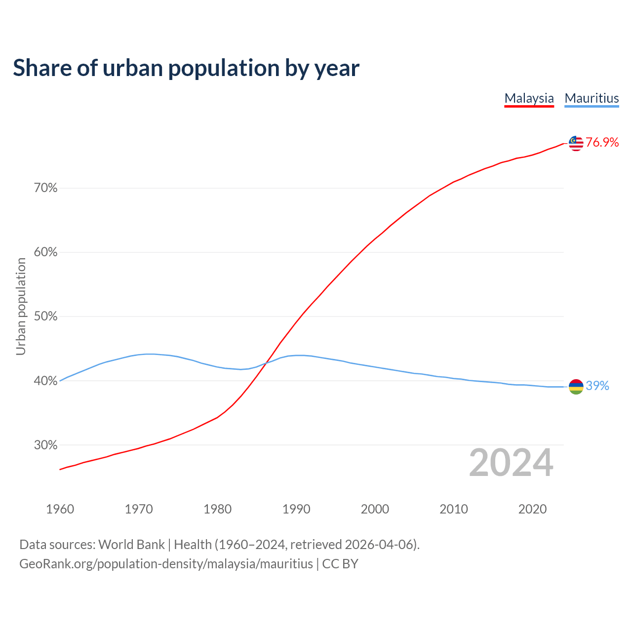 From 2004 to 2024, the share of urban population changed from 66.1% to 76.9% in Malaysia and from 41.3% to 39% in Mauritius.