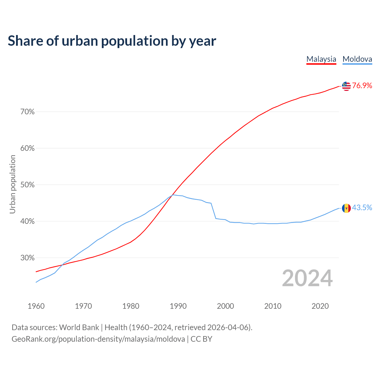 From 2004 to 2024, the share of urban population changed from 66.1% to 76.9% in Malaysia and from 39.4% to 43.5% in Moldova.
