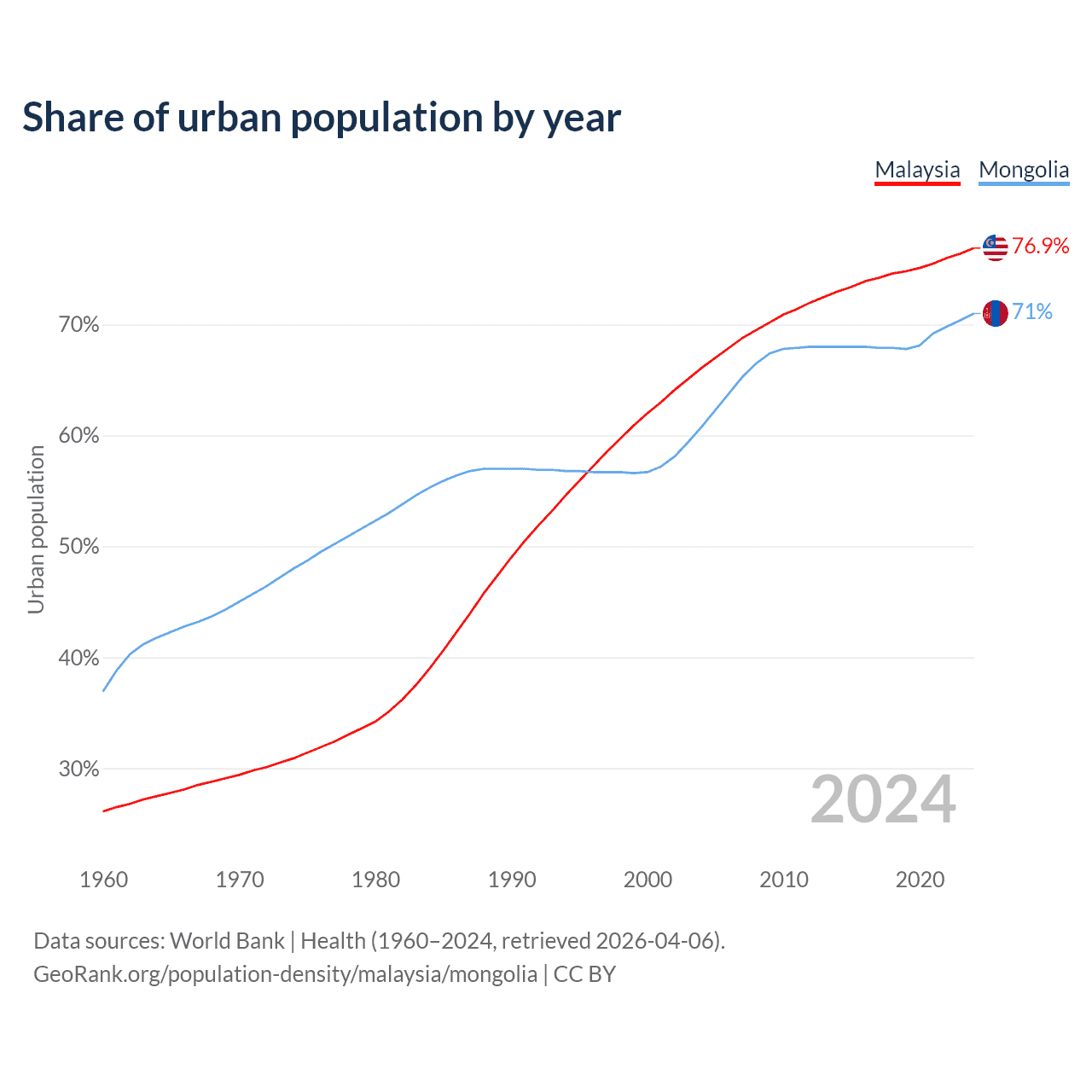 From 2004 to 2024, the share of urban population changed from 66.1% to 76.9% in Malaysia and from 60.8% to 71% in Mongolia.