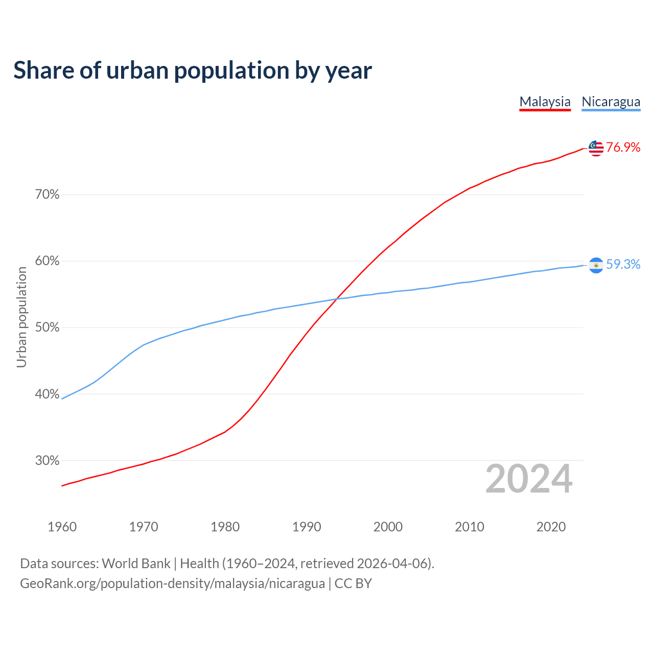 From 2004 to 2024, the share of urban population changed from 66.1% to 76.9% in Malaysia and from 55.8% to 59.3% in Nicaragua.