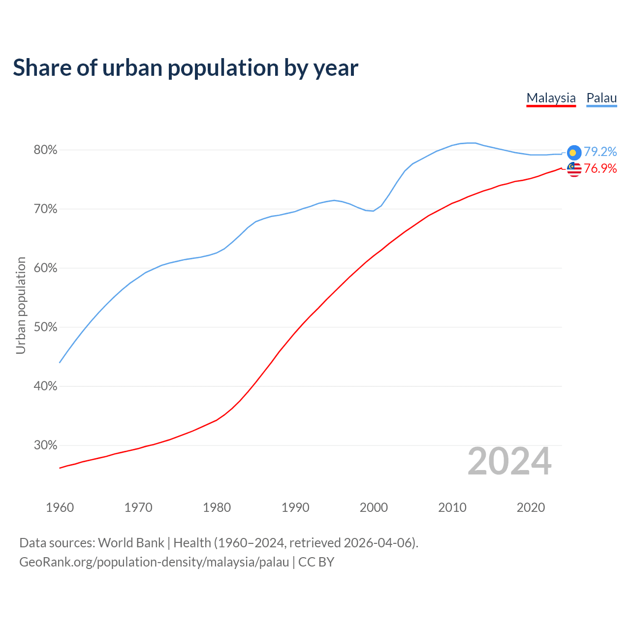 From 2004 to 2024, the share of urban population changed from 66.1% to 76.9% in Malaysia and from 76.4% to 79.2% in Palau.