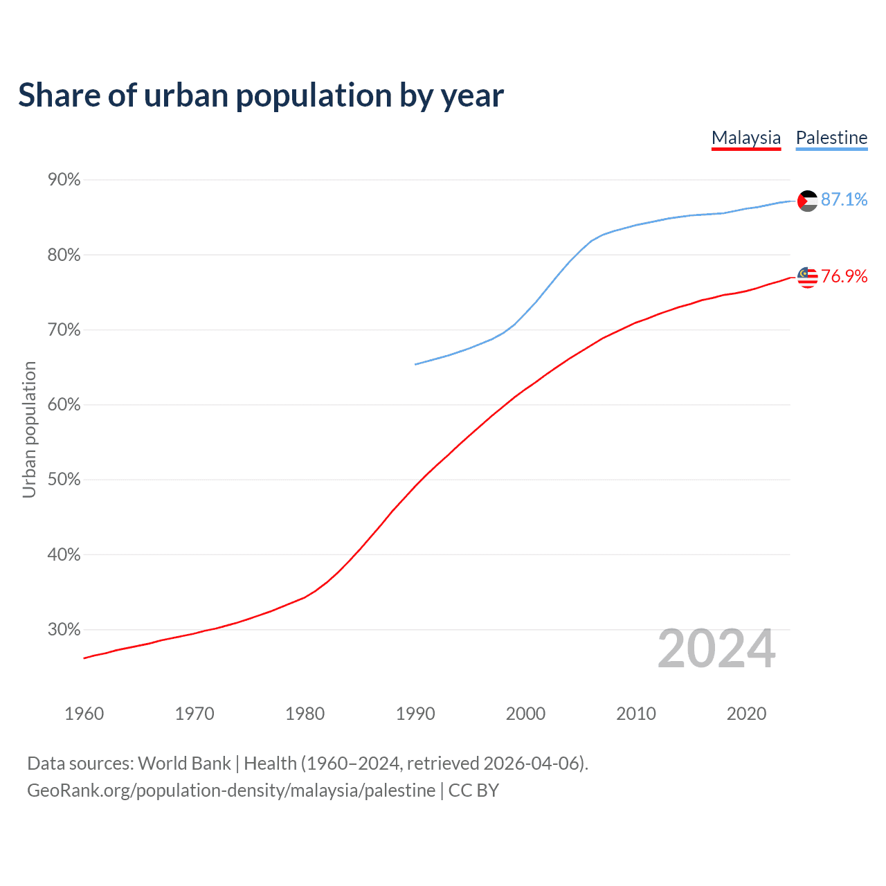 From 2004 to 2024, the share of urban population changed from 66.1% to 76.9% in Malaysia and from 79% to 87.1% in Palestine.