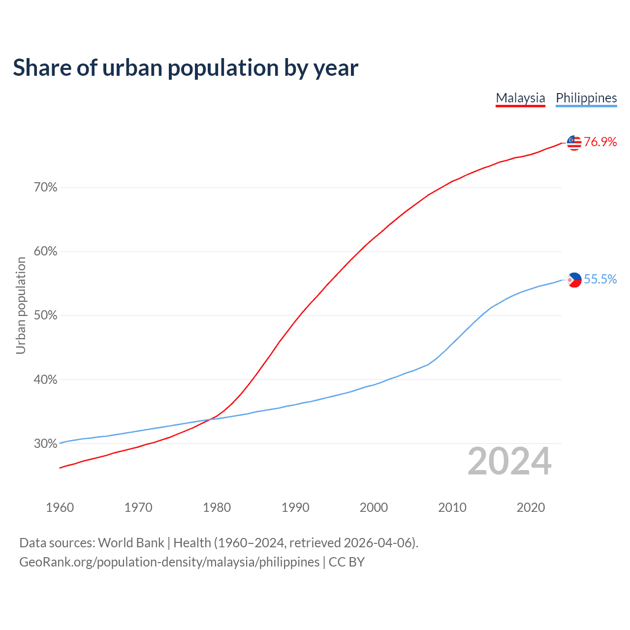 From 2004 to 2024, the share of urban population changed from 66.1% to 76.9% in Malaysia and from 40.9% to 55.5% in the Philippines.