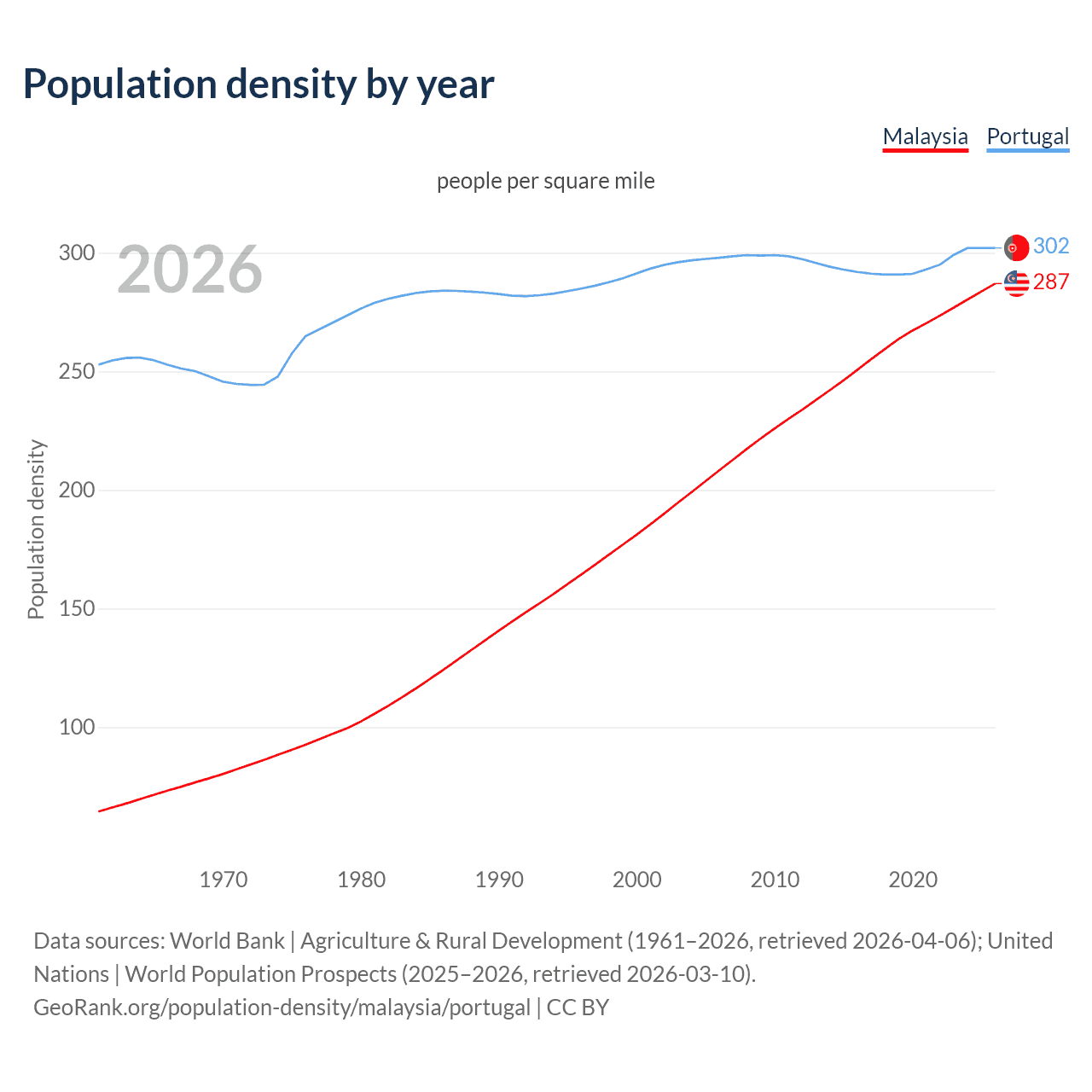 From 2006 to 2026, population density in Malaysia increased by 37.8%, compared to a 1.23% growth in Portugal.
