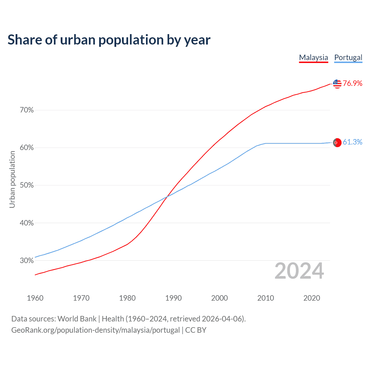 From 2004 to 2024, the share of urban population changed from 66.1% to 76.9% in Malaysia and from 57.4% to 61.3% in Portugal.