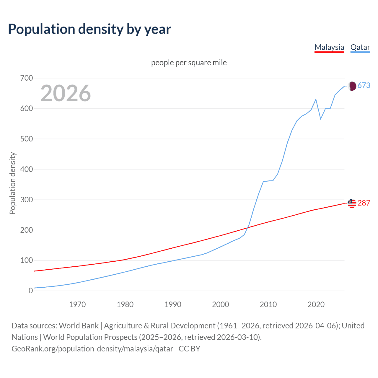 From 2006 to 2026, population density in Malaysia increased by 37.8%, compared to a 210.1% growth in Qatar.