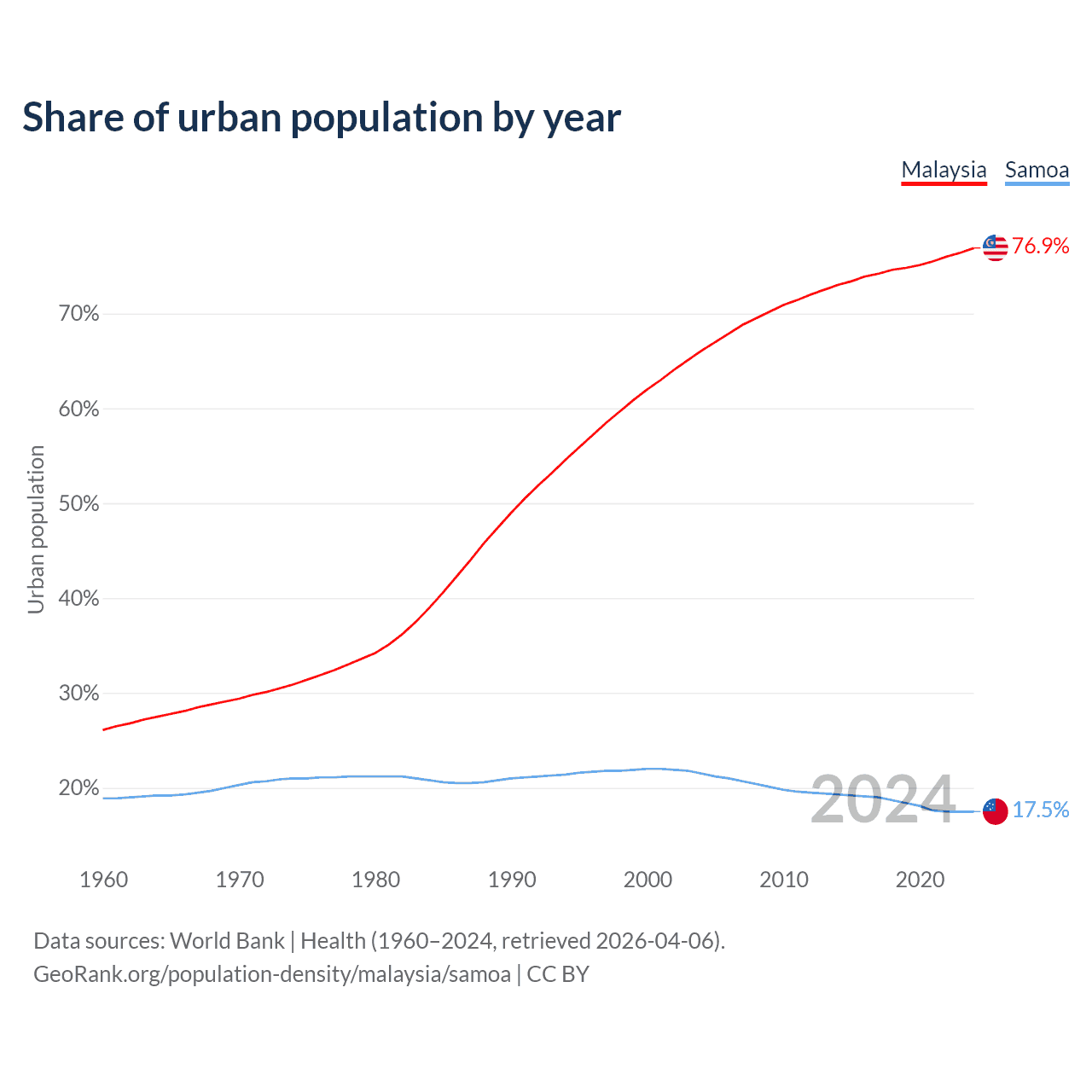 From 2004 to 2024, the share of urban population changed from 66.1% to 76.9% in Malaysia and from 21.5% to 17.5% in Samoa.