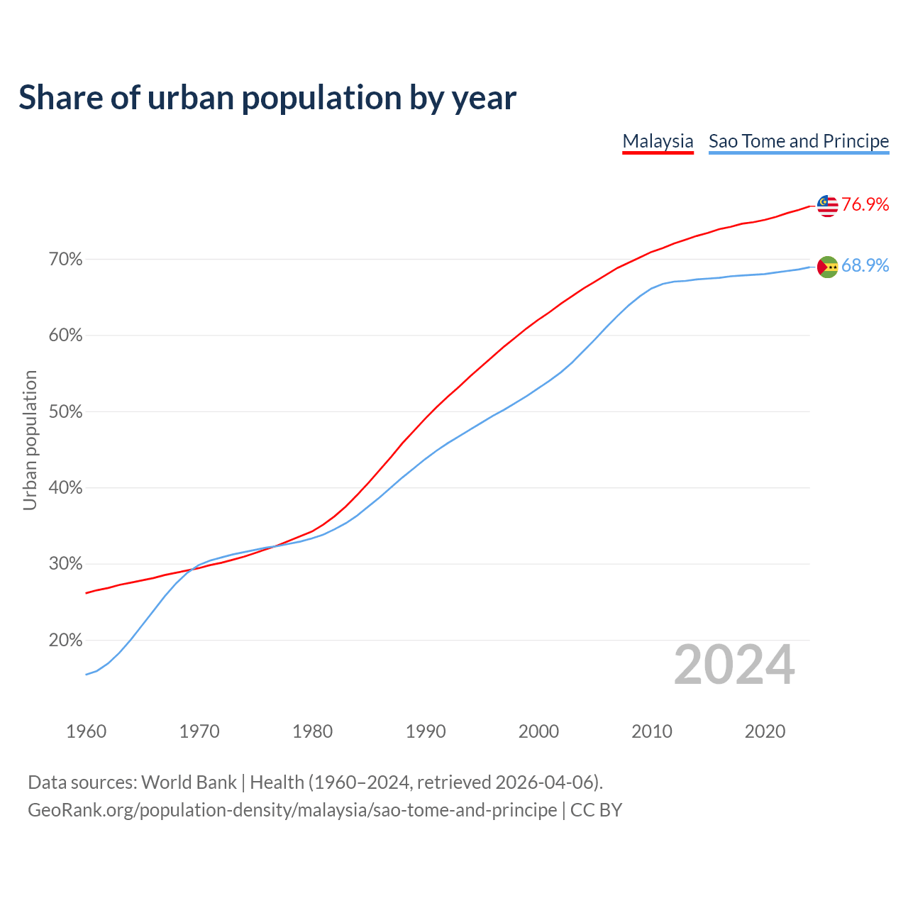 From 2004 to 2024, the share of urban population changed from 66.1% to 76.9% in Malaysia and from 57.9% to 68.9% in Sao Tome and Principe.