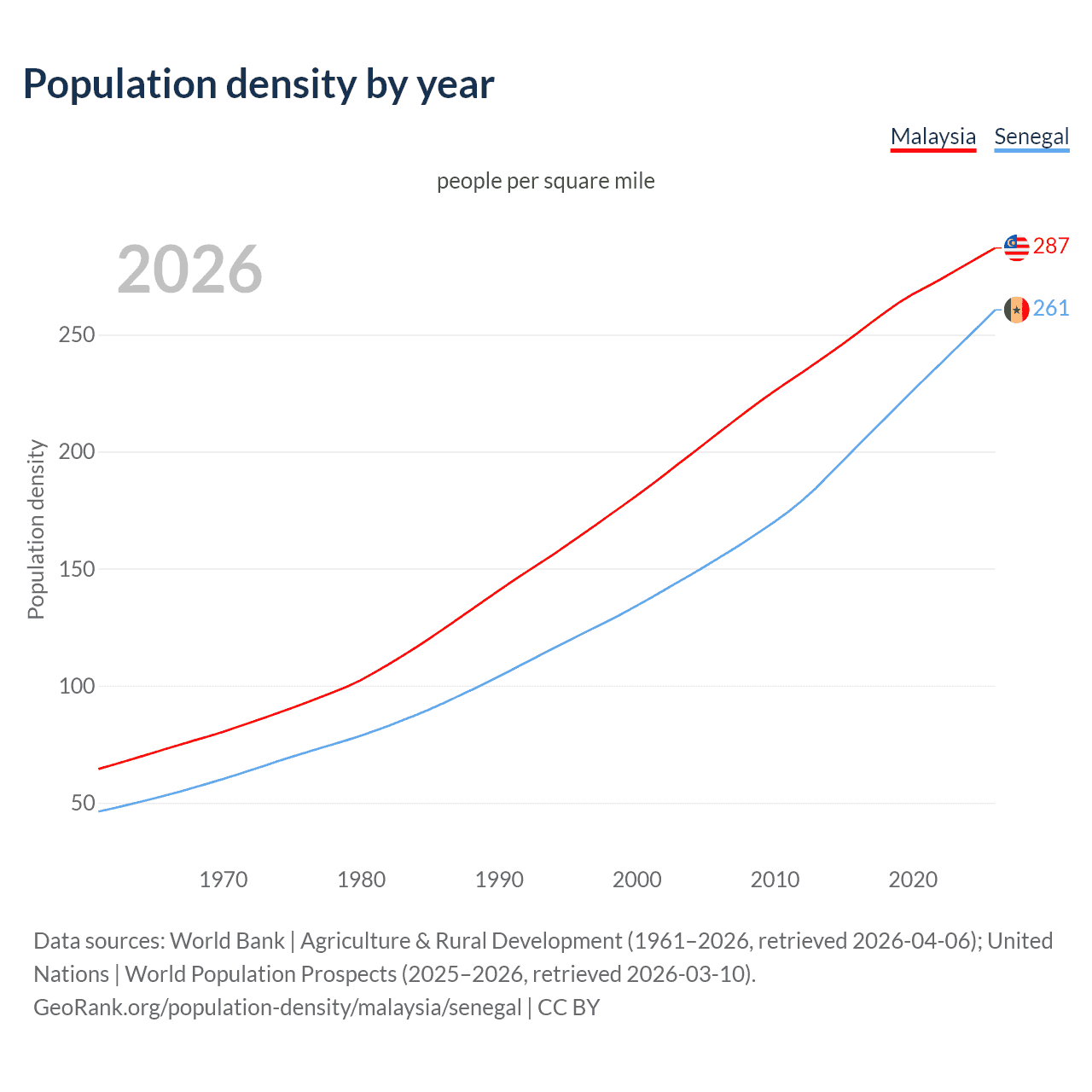 Malaysia has a population density of 287 people per square mile compared to 260.6 people in Senegal. Malaysia has 100,140 sq ft of land per person vs 114,447 sq ft in Senegal. Malaysia and Senegal rank 85th and 95th by population density, respectively.