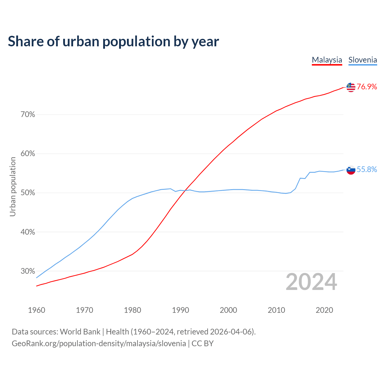From 2004 to 2024, the share of urban population changed from 66.1% to 76.9% in Malaysia and from 50.7% to 55.8% in Slovenia.