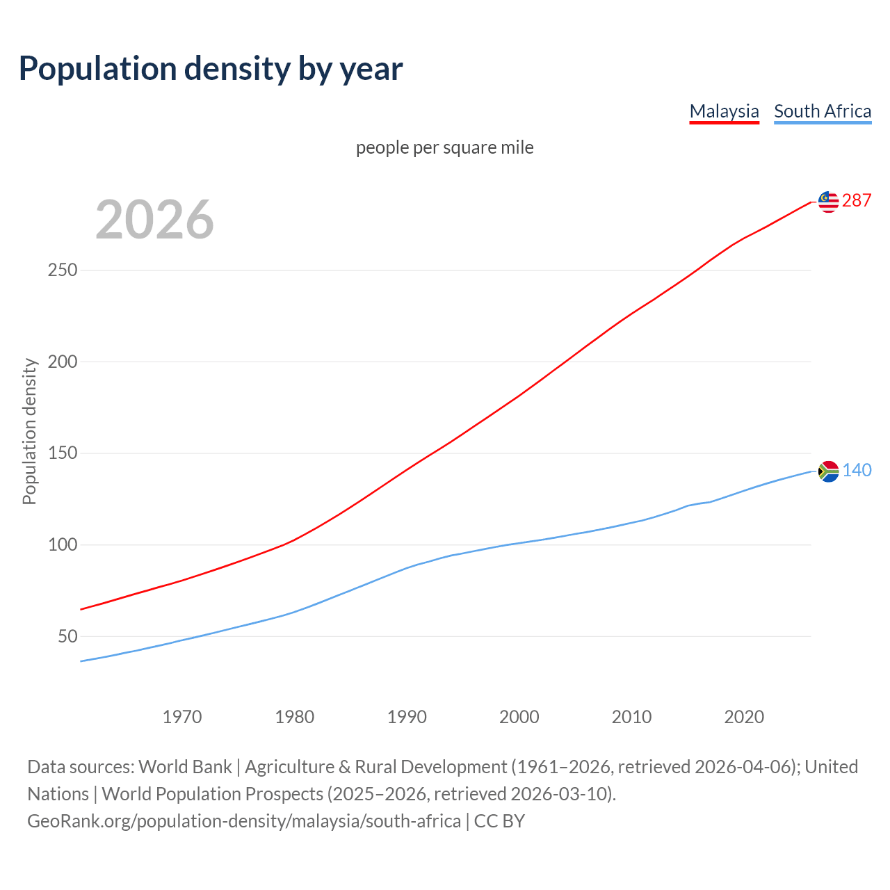 From 2006 to 2026, population density in Malaysia increased by 37.8%, compared to a 31% growth in South Africa.