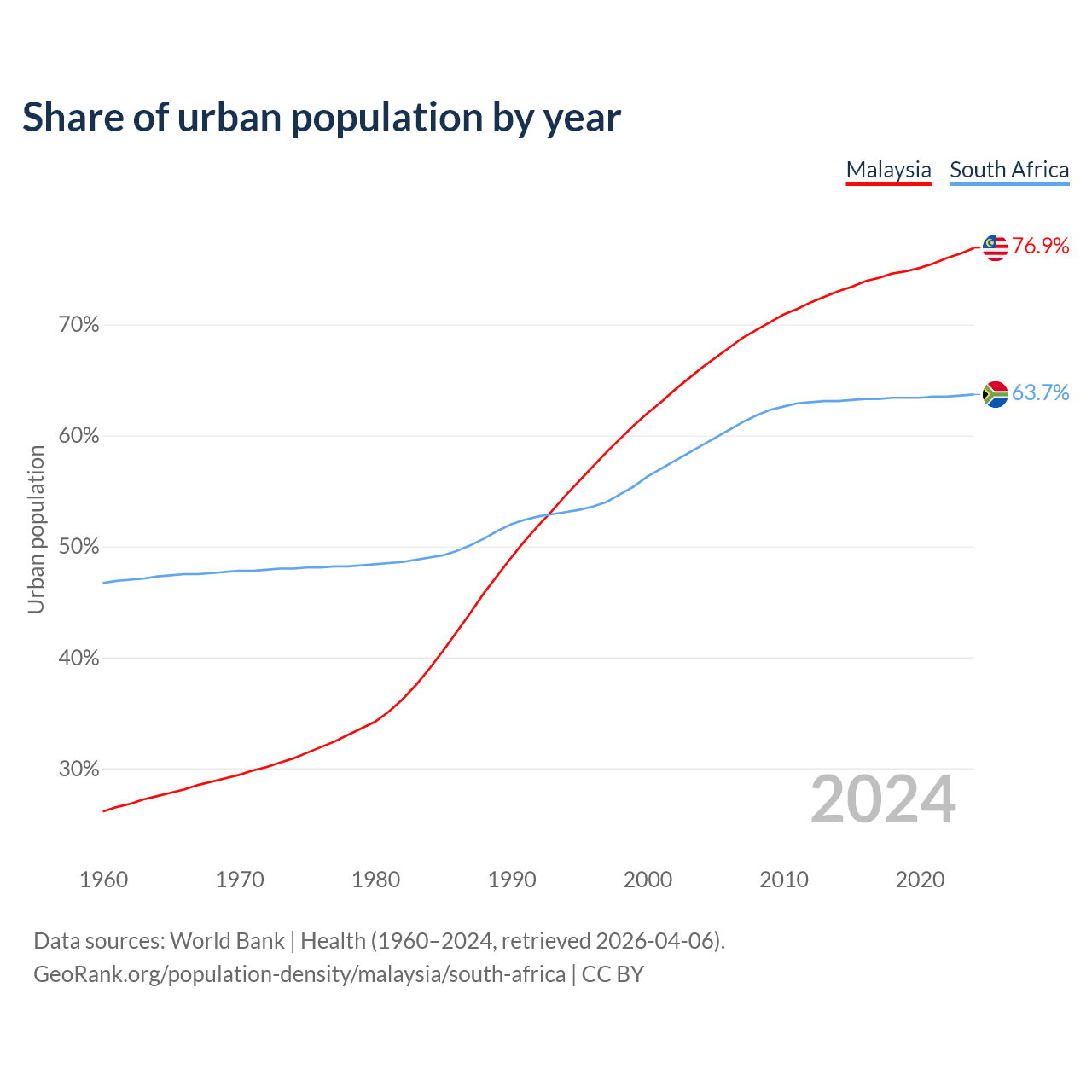 From 2004 to 2024, the share of urban population changed from 66.1% to 76.9% in Malaysia and from 59.1% to 63.7% in South Africa.